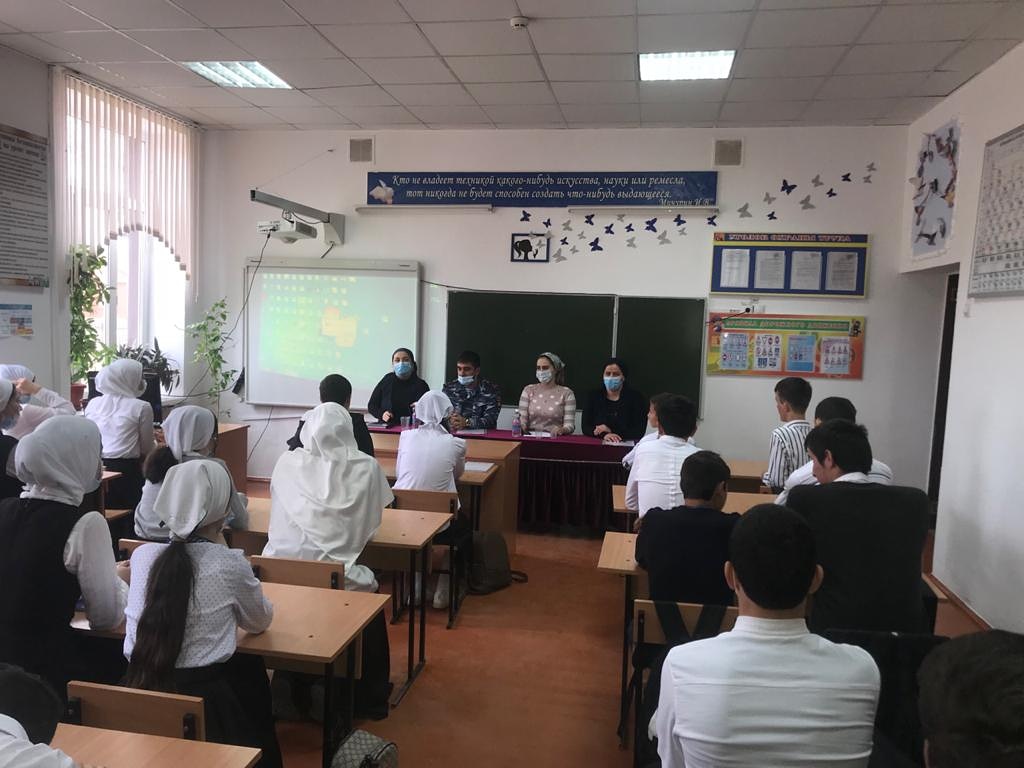 11.11.2020Социальным педагогом МБОУ "Дубовская СОШ" Хутаевой М. А. совместно с завучем по ВР Булуевой З.М., педагогом психологом Саиевой Л.М., педагогом организатором ДТ Мусаниповой С.Д и инспектором ПДН Умхановым Ш.Ш. была проведена беседа с учащимися 9-11-х классов на темы "Мы за здоровый образ жизни", "Соблюдение Устава школы", "Пропаганда правовых знаний среди учащихся сотрудниками ПДН".