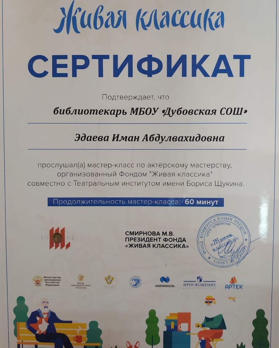 21.12.2020Библиотекарь МБОУ Дубовская СОШ Эдаева Иман Абдулвахидовна прослушала мастер-класс по актёрскому мастерству, организованный Фондом "Живая классика" совместно с Театральным институтом имени Бориса Щукина. Продолжительность мастер- класса: 60 минут.