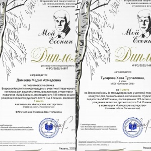 01.01.2021А у нас в первый день Нового года вот такая приятная новость!Учащиеся 5 «А» класса принимали участие во Всероссийском творческом конкурсе «Мой Есенин», посвященном 125-летию со дня рождения великого русского поэта С.А. Есенина. Туларова Хава стала победителем в номинации «Актерское мастерство». Подготовила участницу учитель русского языка и литературы Дамаева М.А.