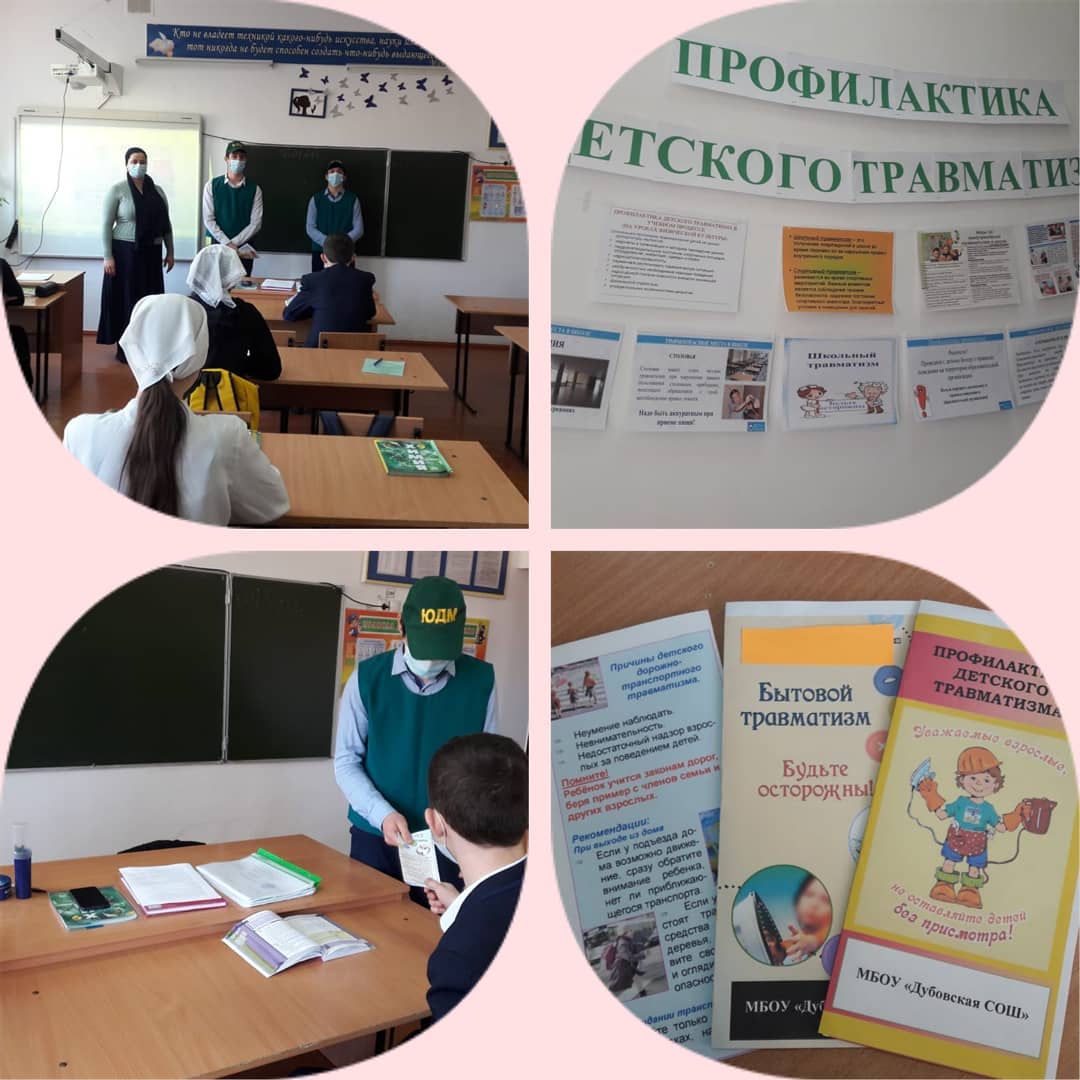 Социальным педагогом Хутаевой М.А. оформлен стенд "Профилактика детского травматизма" и совместно с капитаном и зам.капитана ЮДП была проведена беседа с раздачей буклетов с учащимися 5-11-х классов.
