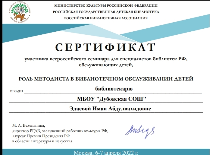Сертификат участника всероссийского семинара для специалистов библиотек РФ, обслуживающих детей:"Роль методиста в библиотечном обслуживании детей".