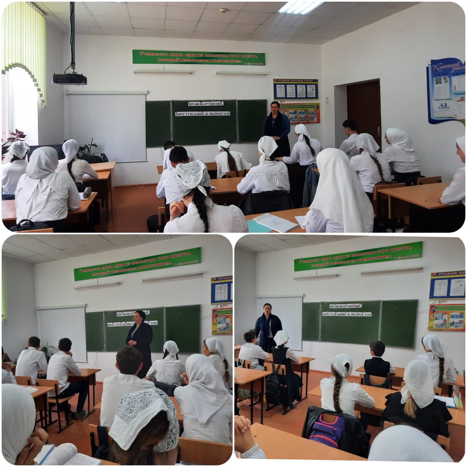 Социальный педагог Хутаева Макка Арбиевна провела беседу "Правонарушение, преступление и подростк" среди учащихся 5-9-х классов.