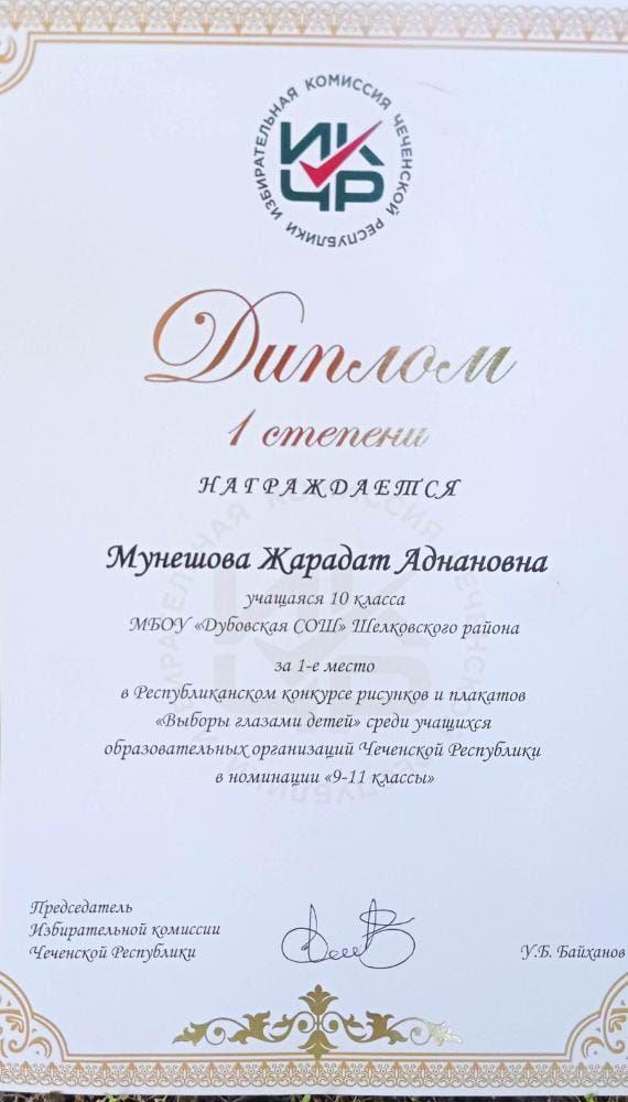 01.06.2022Спешим поделиться с вами нашей радостью! Ученица 10 класса Мунешова Жарадат Аднановна заняла 1-е место в Республиканском конкурсе рисунков и плакатов " Выборы глазами детей" среди учащихся образовательных организаций Чеченской Республики в номинации "9-11 классы". Дала т1аьхье беркате йойла!