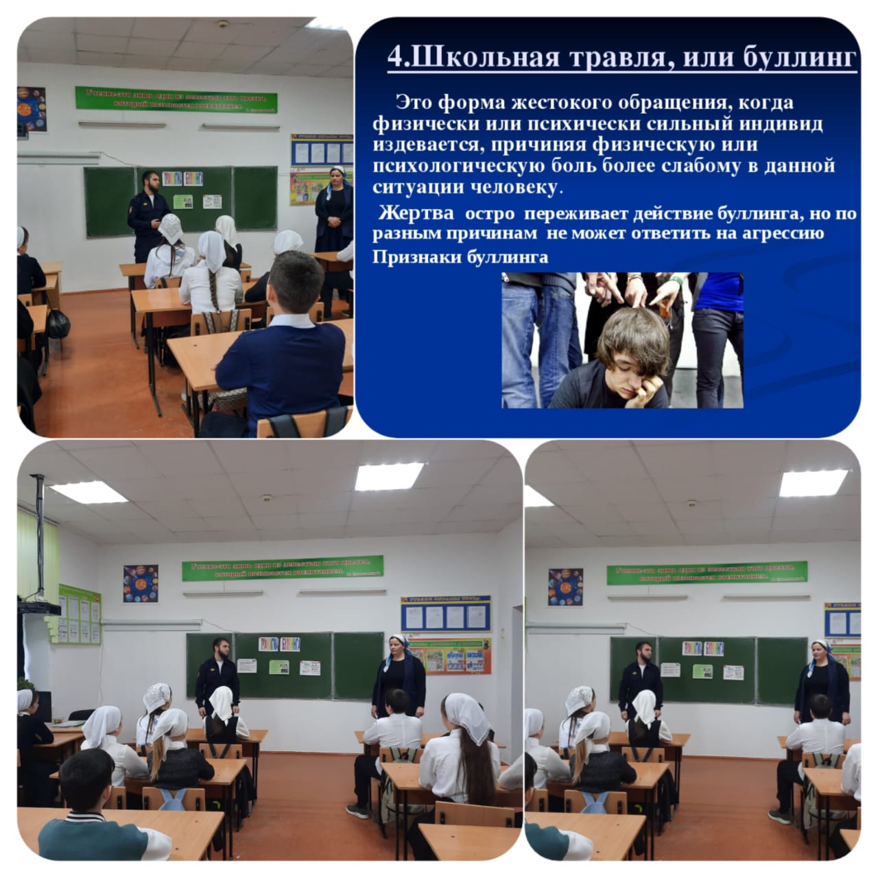 Социальный педагог Хутаева М. А. совместно с инспектором ПДН Усмаевым Р. И. провели беседу с учащимися 6-х классов по теме "Профилактика буллинга".