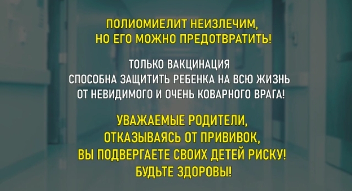 02.03.2023Уважаемые родители!С 27 февраля в Чеченской Республике начата дополнительная иммунизация против полиомиелита, в рамках которой будут привиты дети от 3 месяцев и до 9 лет. Об опасности и тяжёлых последствиях этого заболевания, от которого нет лекарств и способов излечения, должен знать каждый родитель, чтобы позаботиться о здоровье своего ребёнка.Родители, вакцинируйте своих детей – подарите им здоровое и счастливое будущее.