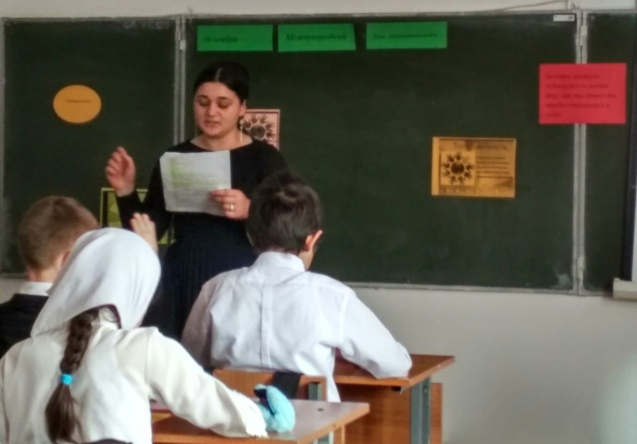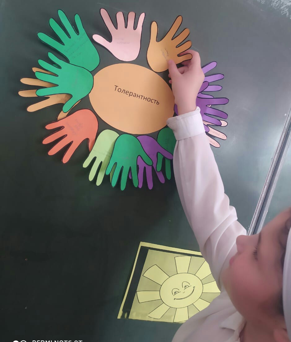 17.11.2023Кл.час "16 ноября- День толерантности " в 5 б классе .Цель :сформировать у учащихся представление о толерантности (возникновение понятия, значение слова, приемы развития этого качества);формировать у учащихся толерантность мышления, уважение к своим правам и правам других людей;воспитывать чувство уважения друг к другу, к обычаям, традициям и культуре разных народов;развивать критическое мышление, навыки групповой работы, умение вести диалог и аргументировать свою позицию, находить компромиссные решения обсуждаемых проблем;способствовать повышению уровня творческой активности учащихся.развитие способности к познанию себя и других людей. Кл.руководитель Кагарманова Я.А.