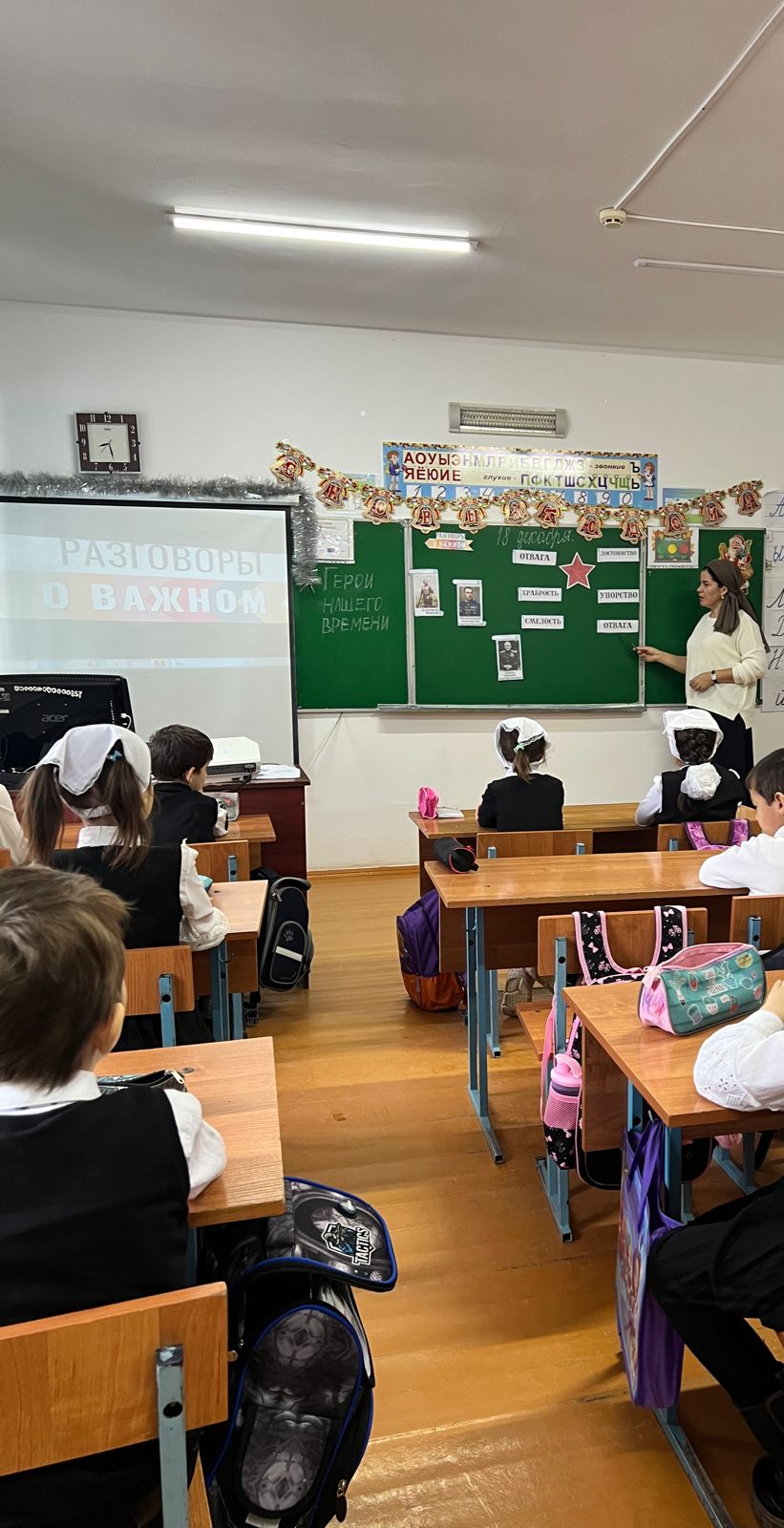 19.12.2023"Разговоры о важном"в 1 а классе. Внеурочное занятие по теме:«ГЕРОИ НАШЕГО ВРЕМЕНИ» Цель занятия: знакомство младших школьников с историей России, еёвыдающимися людьми, героями Отечества, обсуждение мотивов совершениямужественных поступков, проявления героизма, воспитание патриотизма,чувства гордости за вклад героев в благополучие людей, сохранение нашейРодины.Формирующиеся ценности: высокие нравственные идеалы, приоритетдуховного над материальным, служение Отечеству и ответственность за егосудьбу.Кл.рук.Хункарханова М.С.