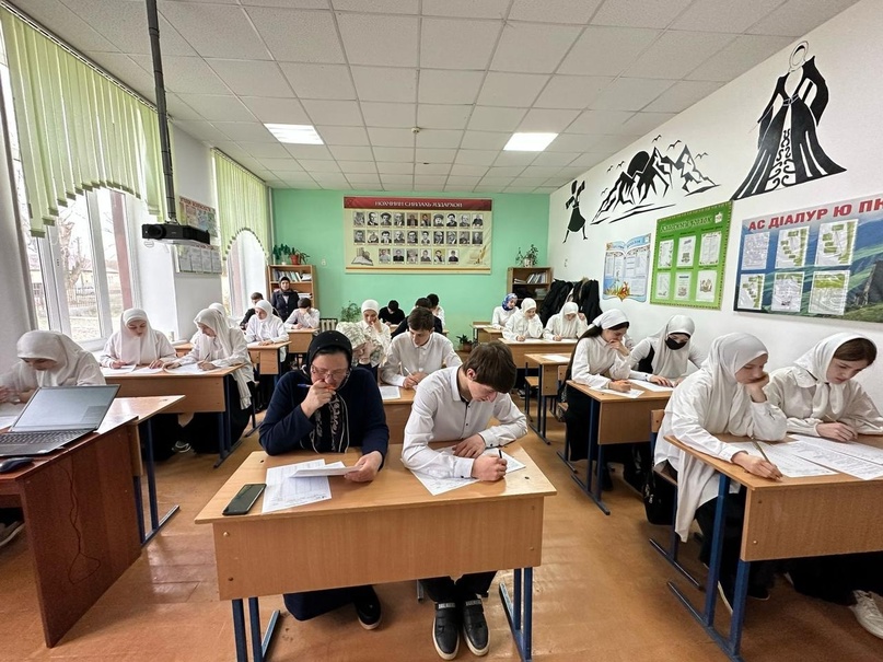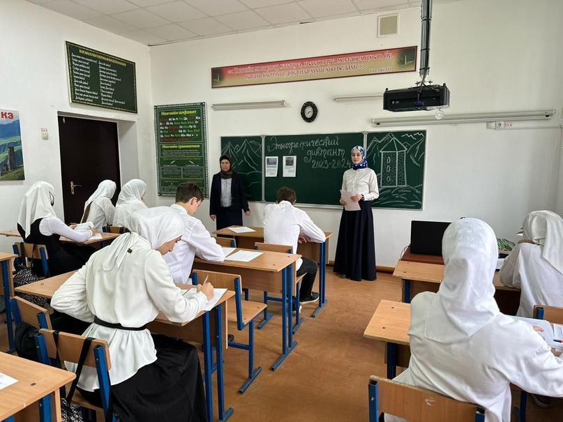 16 февраля в нашей школе учителя чеченского языка Алсултанова Таус Магомедовна и Минкаилова Марха Уахитовна провели этнографический диктант 2023-2024 "Беза, бовза ненан мотт"