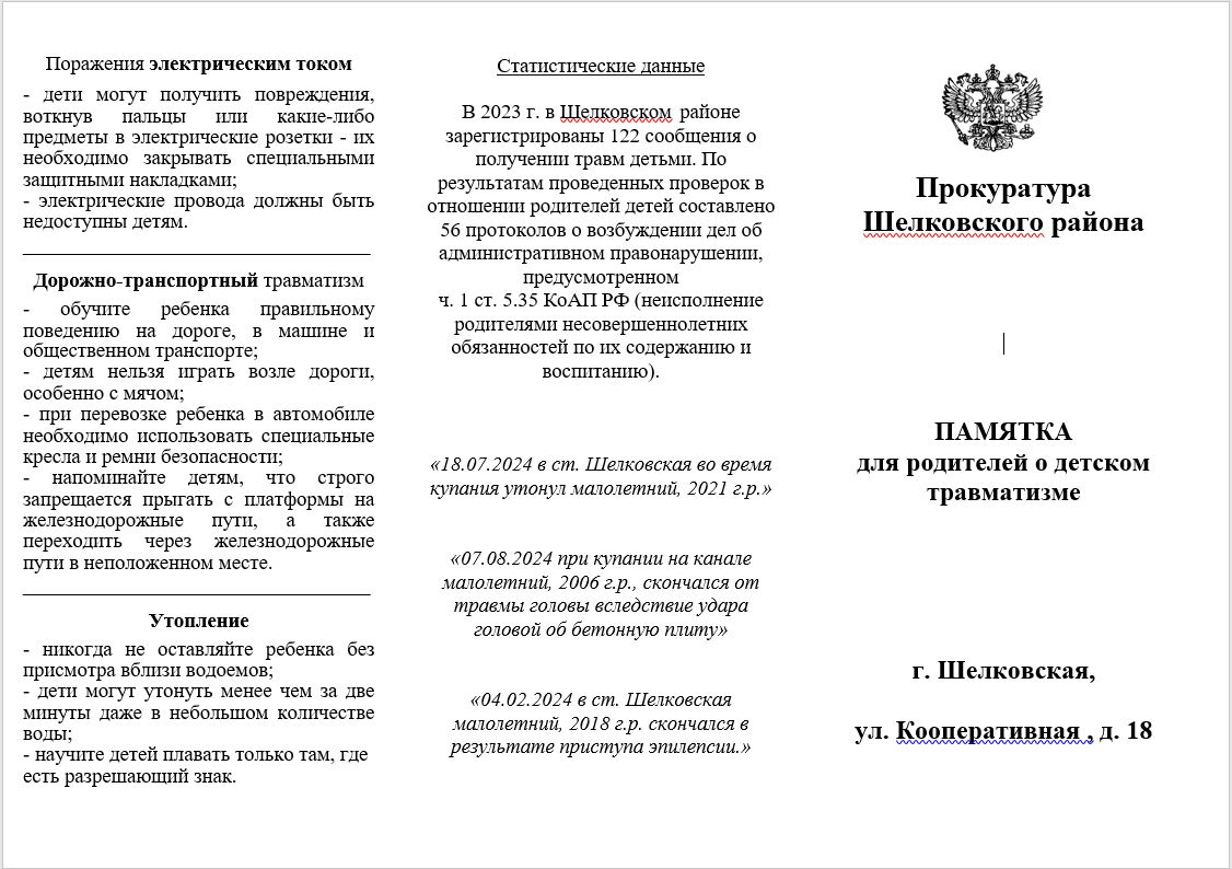 В 2023 г. в Шелковском районе зарегистрированы 122 сообщения о получении травм детьми. По результатам проведенных проверок в отношении родителей детей составлено 56 протоколов о возбуждении дел об административном правонарушении, предусмотренном ч. 1 ст. 5.35 КоАП РФ (неисполнение родителями несовершеннолетних обязанностей по их содержанию и воспитанию).