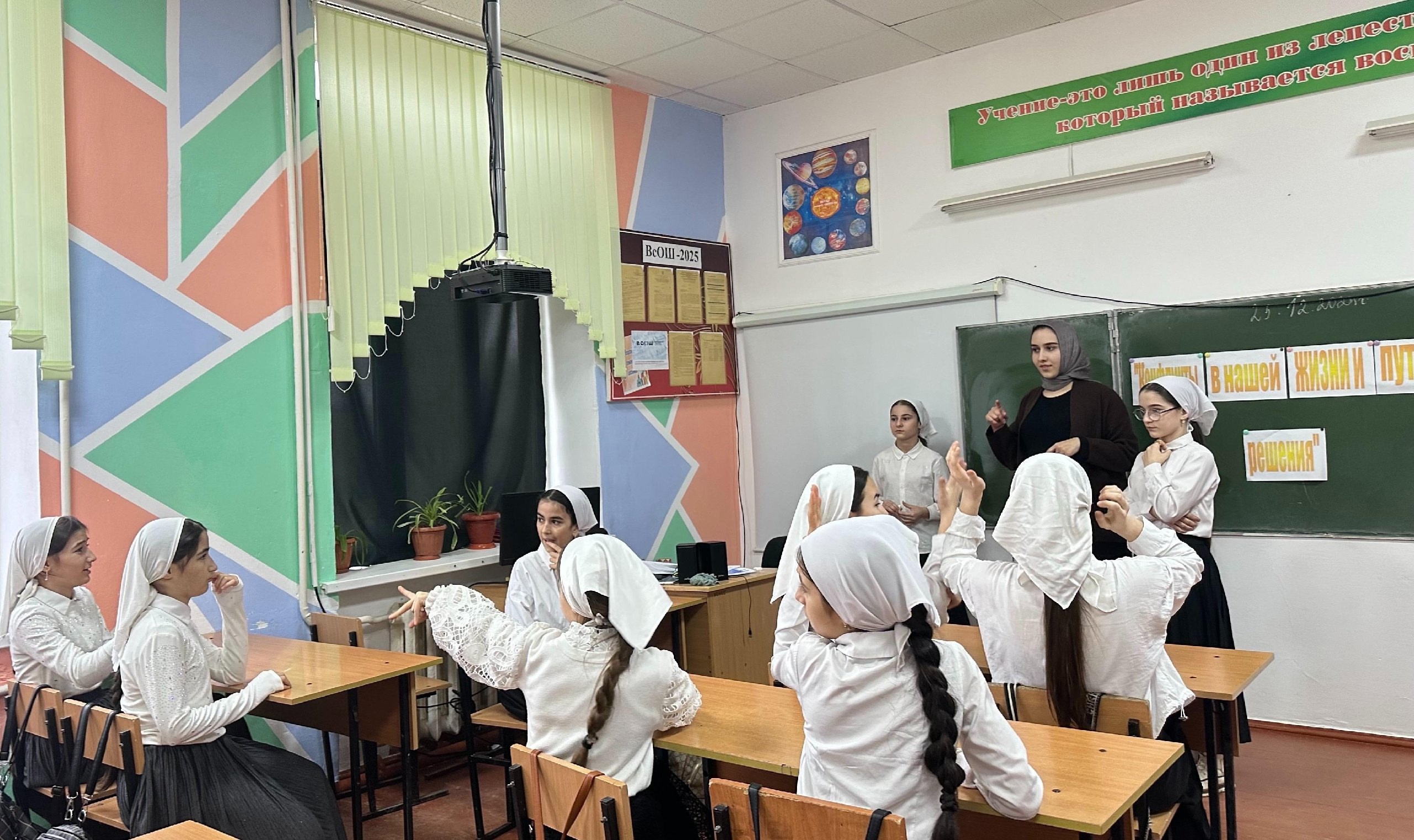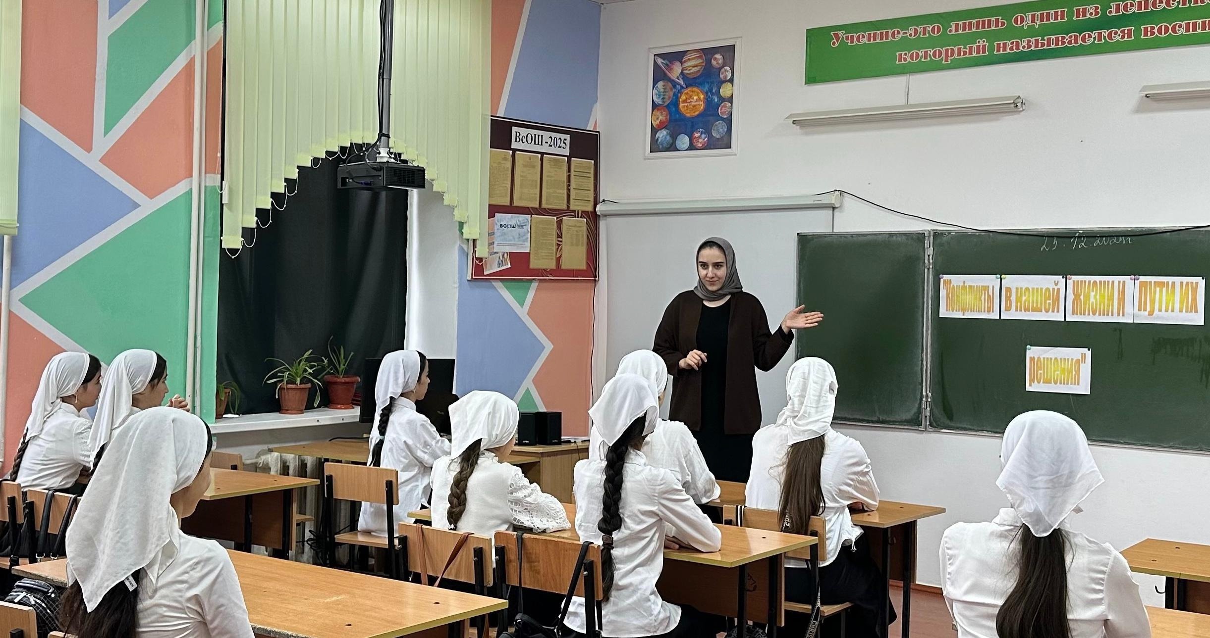 25.12.2024Педагог-психолог Саиева Л. М. Провела классный час по теме: «Конфликты в нашей жизни и пути их решения»среди учащихся 6-7классов. Рассказала ребятам о возможных способах решения школьных конфликтов.Провела беседу с целью научить детей воспринимать жизненные трудности, сопровождающиеся различными эмоциями и переживаниями, ориентировать обучающихся на позитивные стороны жизни, успех и доброе отношение к окружающим, формировать чувство толерантности и ответственности за свои поступки.