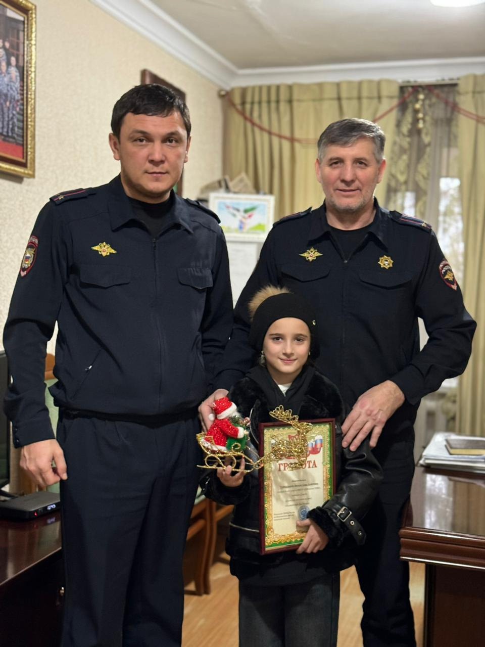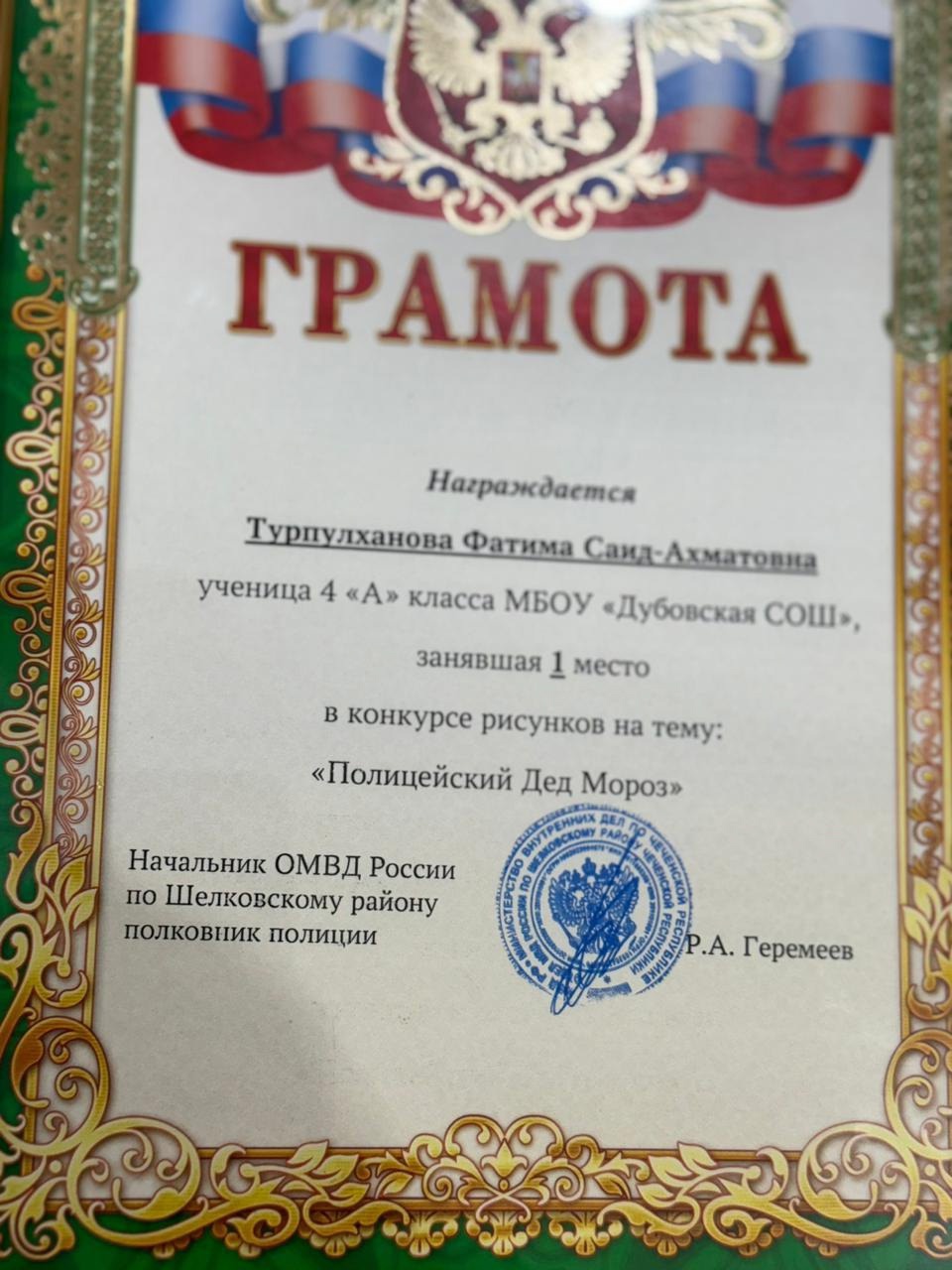 28.12.2024В рамках Всероссийской акции «Полицейский Дед Мороз» ОМВД России по Шелковскому району проводил конкурс рисунков среди обучающихся 1-4 классов образовательных учреждений Шелковского муниципального района.Все работы были размещены на Telegram-канале.По итогам голосования,которое проходило с 20 по 25 декабря , рисунок ученицы нашей школы Турпулхановой Фатимы набрал наибольшее число голосов и занял 1 место. Фатима награждена грамотой, а также подарками и денежной премией. С чем мы её и поздравляем 🪄.