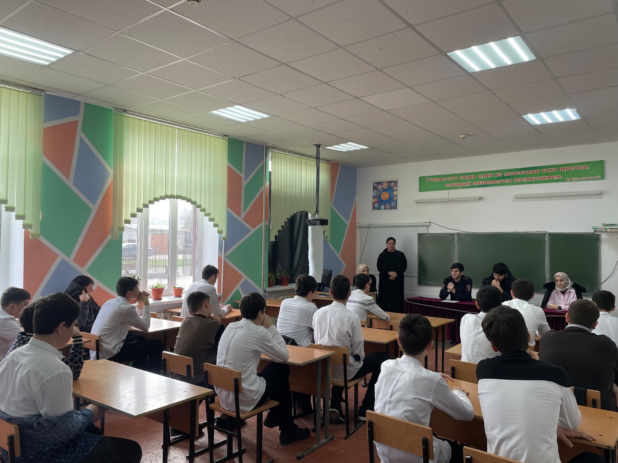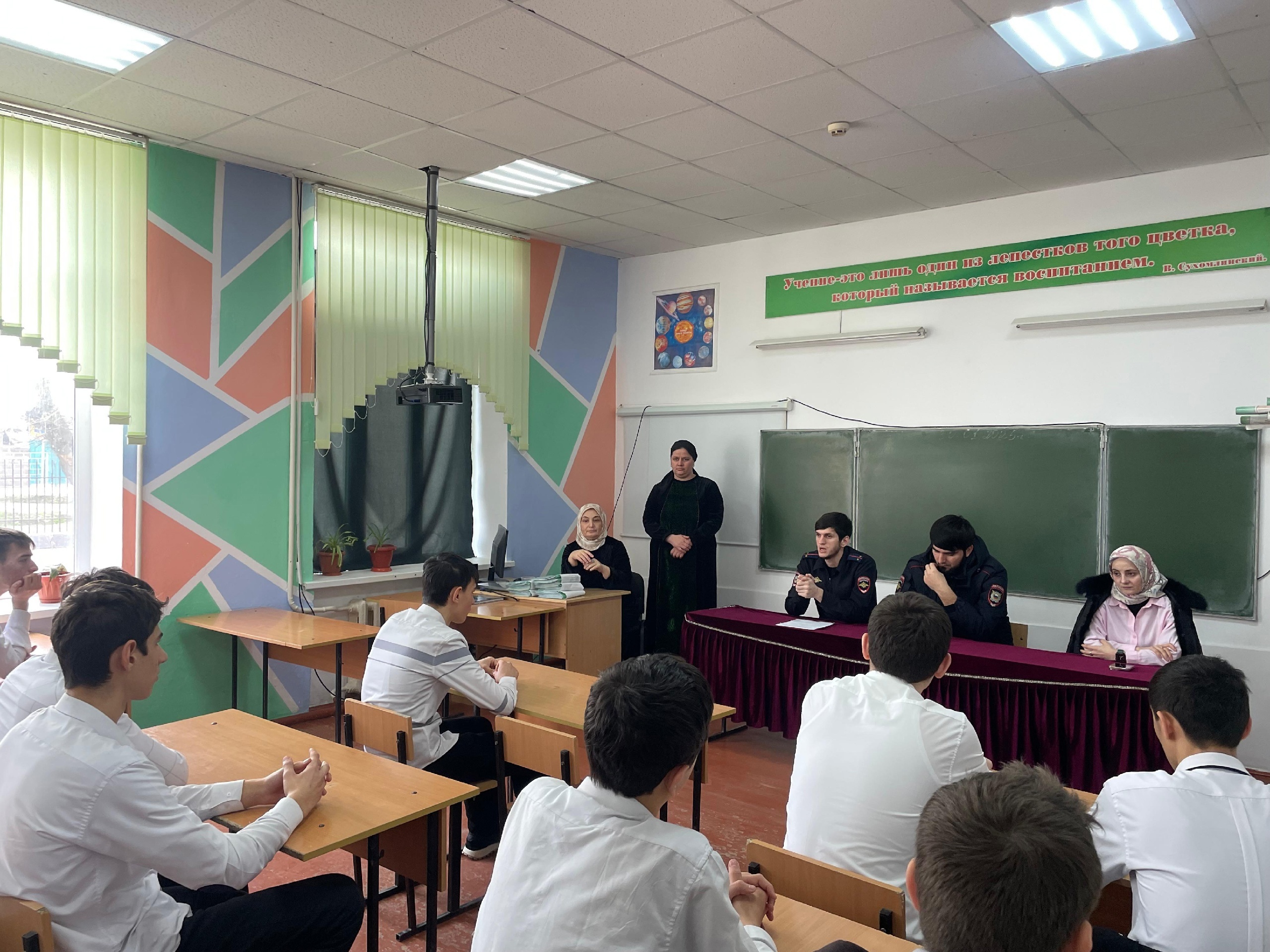 30.01.2025Сегодня зам. директора по ВР Булуевой З.М., соц. педагогом Хутаевой М.А. совместно с инспектором ПДН Айгумовым Д.И-А., участковым ст. Дубовская Джамалиевым Ш.Х., и.о. главы администрации Дубовского сельского поселения Байхановой З.Д. с учащимися 9-11-х классов провели беседупо профилактике правонарушений среди несовершеннолетних«Преступление и подросток». Целью которой являлась:- профилактика правонарушений несовершеннолетних;- пропаганда правовых знаний;- формирование навыков самостоятельного принятия ответственного решения;* формирование навыков критического анализа сложных ситуаций;* формирование у учащихся понимания того, что, совершая проступок, они не только нарушают Закон, но и причиняют боль своим родным и другим людям.