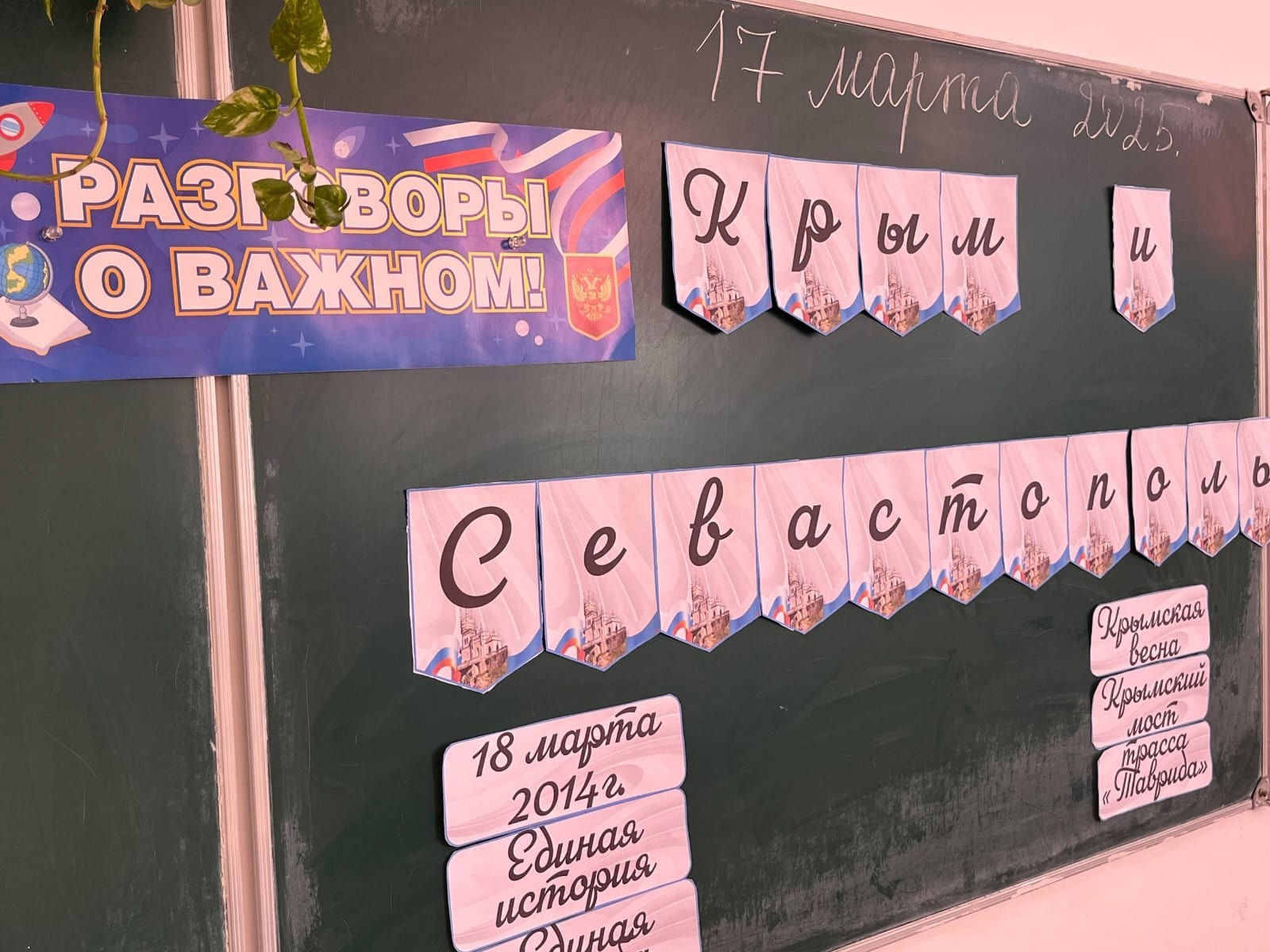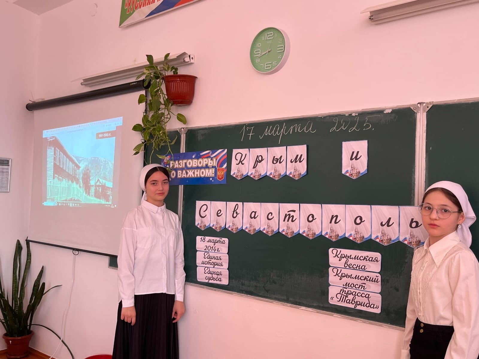 18.03.2025На «Разговорах о важном» 17 марта классные руководители 1-11 классов рассказали учащимся о воссоединении Крыма с Россией и 100-летии «Артека».Цель занятий: воспитание ценностного отношения к истории своей страны, понимание исторического значения воссоединения Крыма и Севастополя с Россией. Ребята ответили на вопросы, связанные с этим событием.Также учащиеся просмотрели видео о Международном детском центре «Артек». Первые лица государства, в числе которых первый вице-премьер РФ Денис Мантуров, полномочный представитель Президента РФ в СКФО Юрий Чайка и председатель ЦИК РФ Элла Памфилова, рассказали, за какие достижения они в свое время получили путевку в «Артек» и чем им запомнился детский центр.Своими воспоминаниями поделились также другие известные артековцы разных лет: ректор МГИМО Анатолий Торкунов, актриса и телеведущая Екатерина Стриженова, солист группы «Иванушки International» Андрей Григорьев-Апполонов и актер Алексей Онежен.Зам. директора по ВР З. М. Булуева.