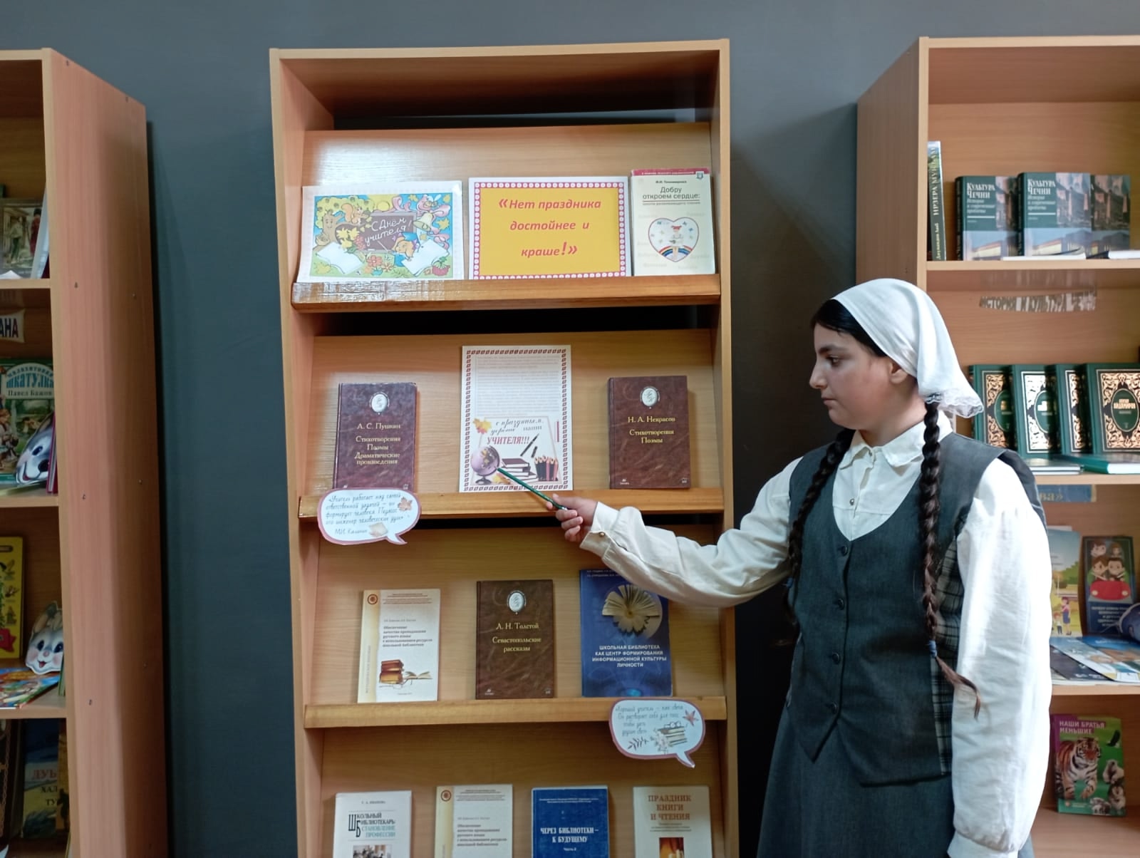 07.10.2025В нашей школе библиотекарем Эдаевой Иман Абдулвахидовной была оформлена книжно-иллюстративная выставка по теме: " Учитель - профессия вечная". Цели книжной выставки:Познакомить учащихся с литературой об учителях и педагогике: Предоставить книги, которые рассказывают о роли учителей в обществе, их вкладе в образование и воспитание.Стимулировать интерес к профессии учителя: Показать, насколько важна и многогранна работа учителя, через биографии известных педагогов и методические пособия.