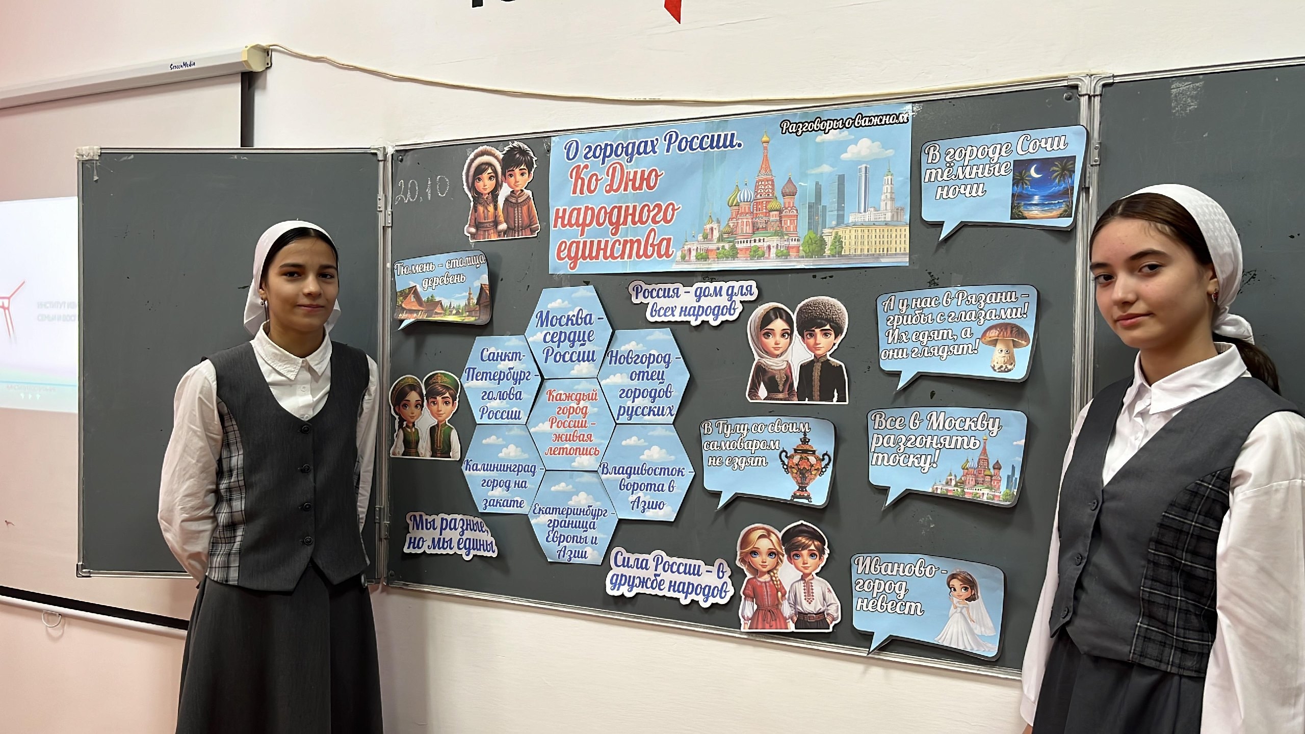 21.10.2025В преддверии Дня народного единства очередное занятие цикла «Разговоры о важном» посвятили городам России.20 октября ученики нашей школы отправились в настоящее путешествие по самым разным уголкам страны ― от древних городов до современных мегаполисов, от исторических центров до молодых промышленных и культурных площадок. Через разговор о городах классные руководители 1-11 классов и дети размышляли о том, что делает россиян единым народом, какие ценности объединяют жителей России и почему каждый город — это особая часть большой истории страны.Зам. директора по ВР З. М. Булуева.