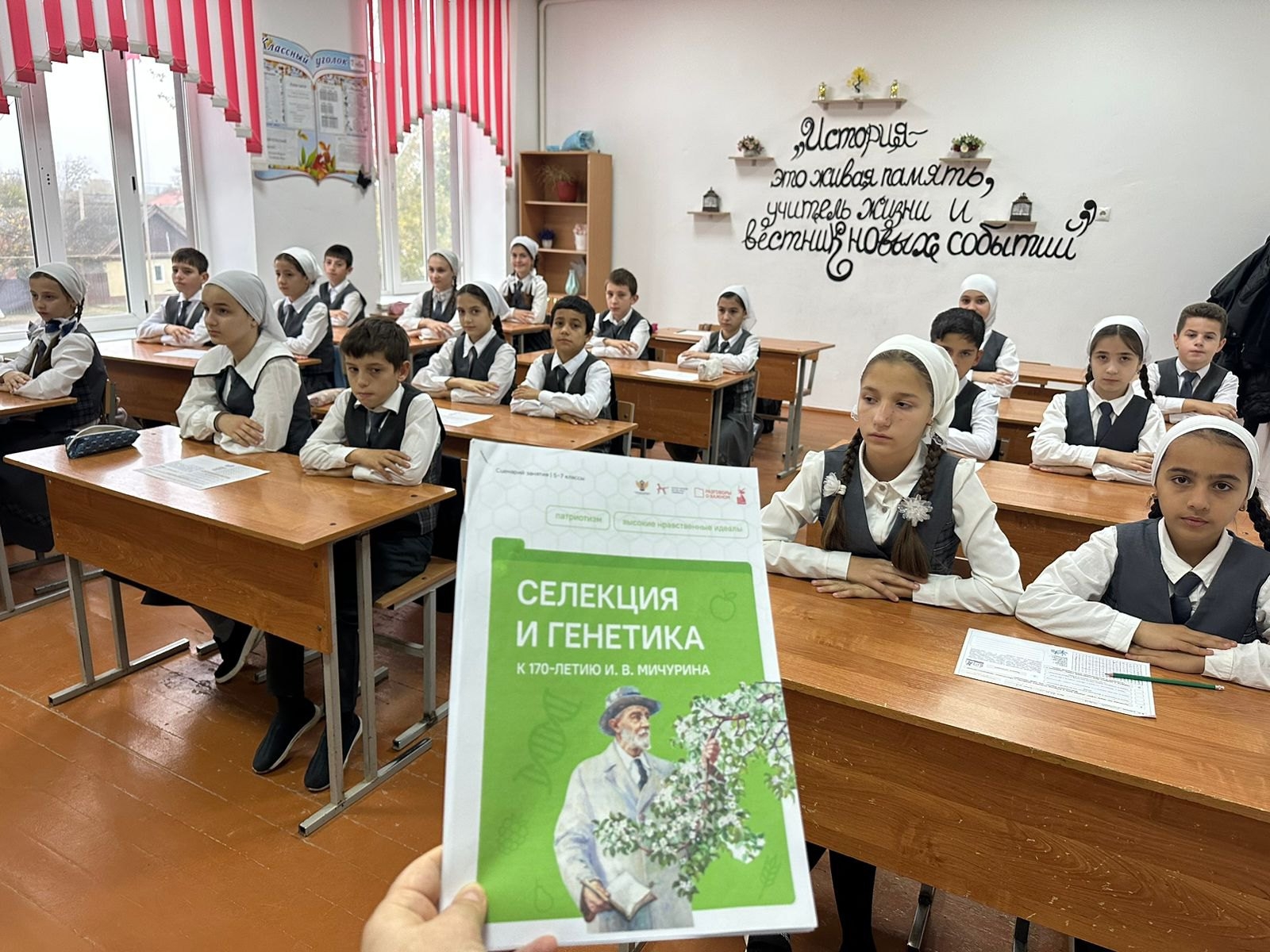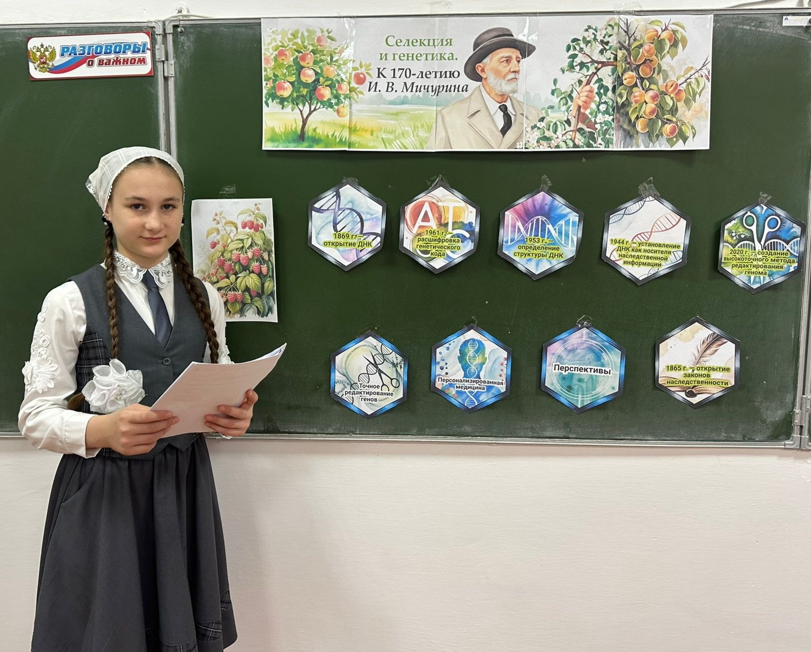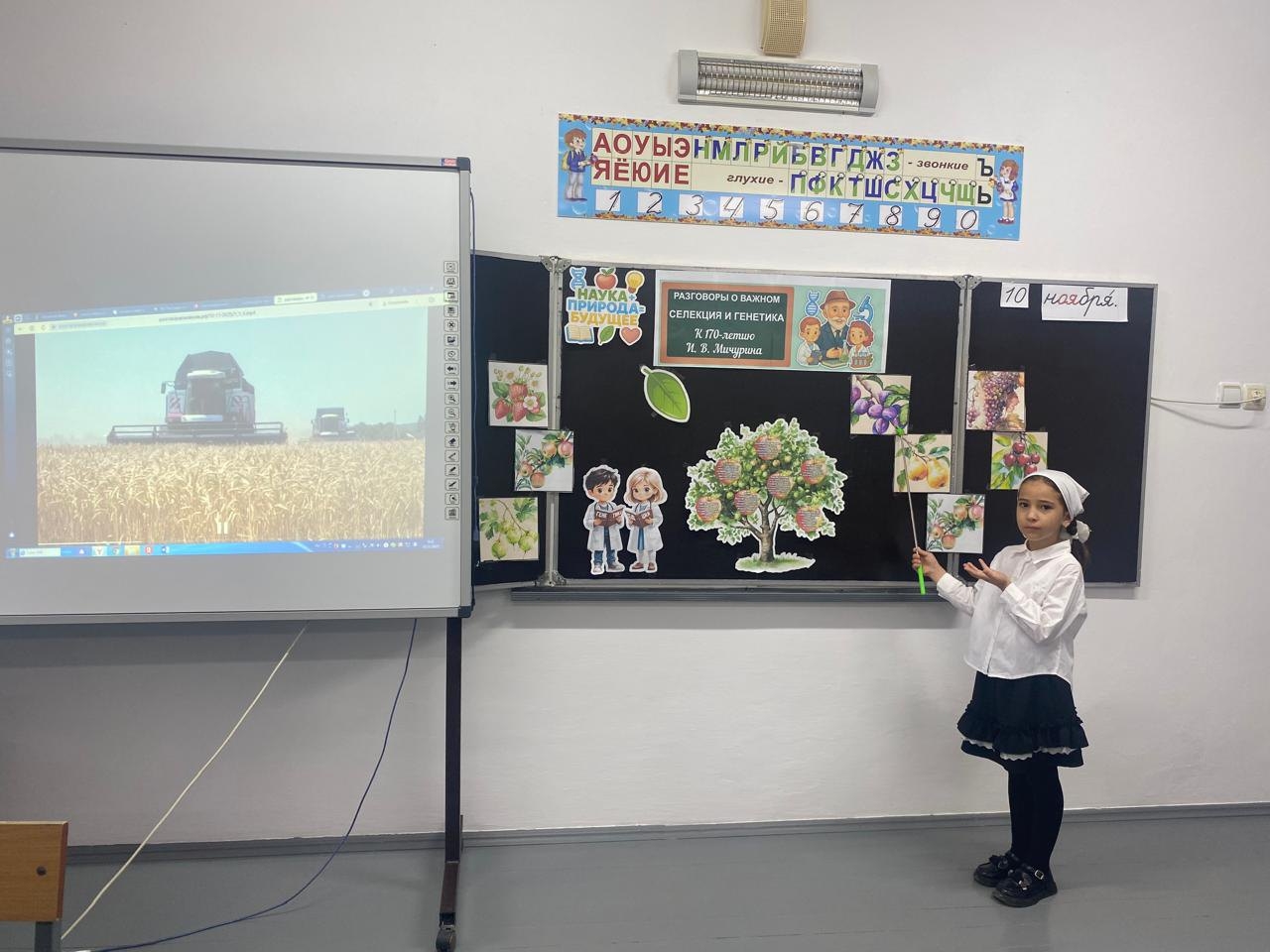 10.11.2025В рамках проекта «Разговоры о важном» 10 ноября в нашей школе прошли занятия , посвященные теме «Селекция и генетика. К 170-летию И.В. Мичурина». Партнером занятия выступило Министерство сельского хозяйства Российской Федерации.В ходе занятий учащиеся 1-11 классов погрузились в мир аграрной науки, узнали, как создаются новые сорта растений, какие достижения сделали Россию одной из ведущих стран в области биотехнологий и продовольственной безопасности. Узнали об Иване Владимировиче Мичурине — человеке, чье имя стало символом трудолюбия, новаторства и веры в возможности отечественной аграрной науки.Зам. директора по ВР З. М. Булуева.