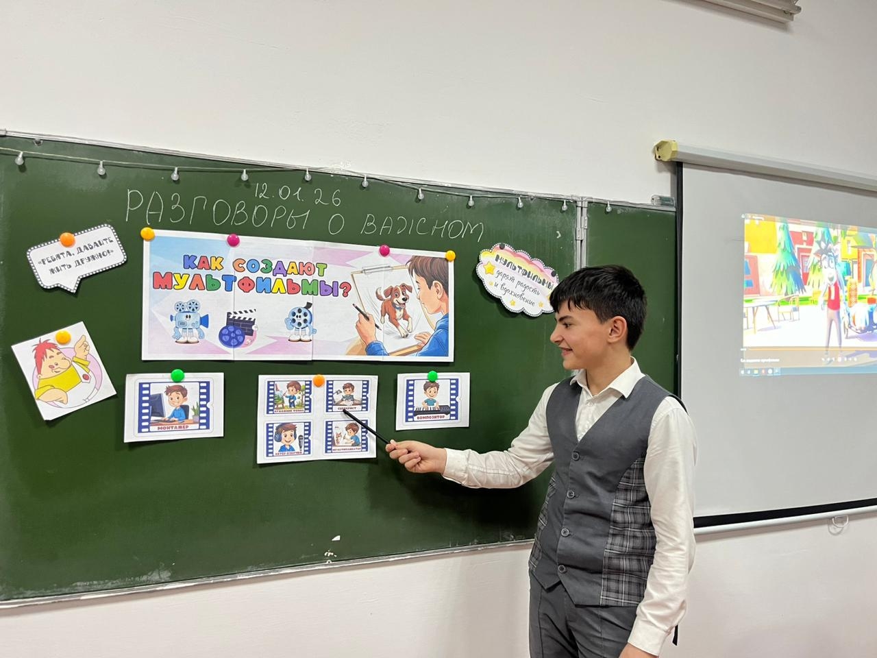 12.01.2026Разговоры о важном.12 января 2026 года в 1-11 классах нашей школы прошли внеурочные занятия "Как создаются мультфильмы", на которых ребята узнали много нового о мире анимации.Вспомнили любимые мультфильмы легендарной студии «Союзмультфильм», которая почти 90 лет дарит нам добрые и умные истории. Также обсудили процесс создания мультфильмов, узнали об озвучивании персонажей и важной роли актеров в создании уникальной атмосферы.Особое внимание уделили тому, чему учат нас советские мультфильмы : дружба, честность, доброта и справедливость. Эти ценности остаются актуальными и сегодня.Зам. директора по ВР З. М. Булуева.